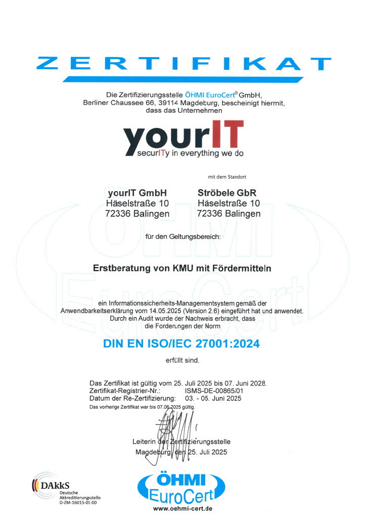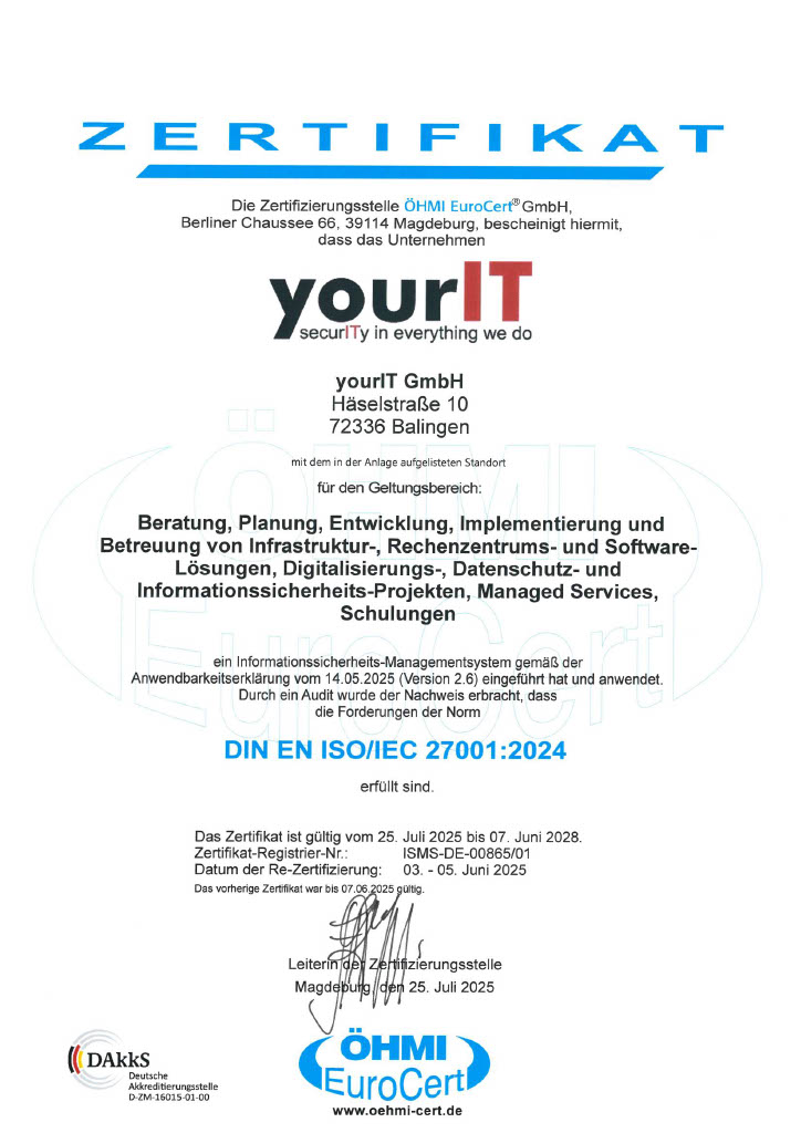Wir haben unser Informationssicherheits-Managementsystem (ISMS) neutral zertifizieren lassen. Unser ISMS wurde erstmalig in 2016, seither in mehreren Überwachungsaudits und zuletzt im Rezertifizierungssaudit 2019 nach der DIN EN ISO/IEC 27001:2017 gemäß den Vorgaben der Deutsche Akkreditierungsstelle (DAkkS) auditiert.